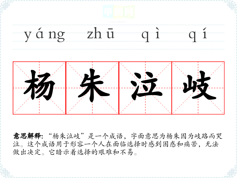 - 反义成语:果断决策,迅速行动。它们强调在选择中能够迅速做出决策,与“杨朱泣岐”的犹豫形成对比。