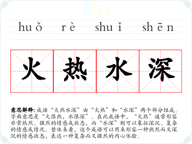 成语“火热水深”由“火热”和“水深”两个部分组成。字面意思是“火很热,水很深”。在此成语中,“火热”通常形容非常热烈、强烈的情感或状态,而“水深”则可以象征深沉、复杂的情感或情况。整体来看,这个成语可以用来形容一种热烈而又深沉的情感状态,表达一种复杂而又强烈的内心体验。