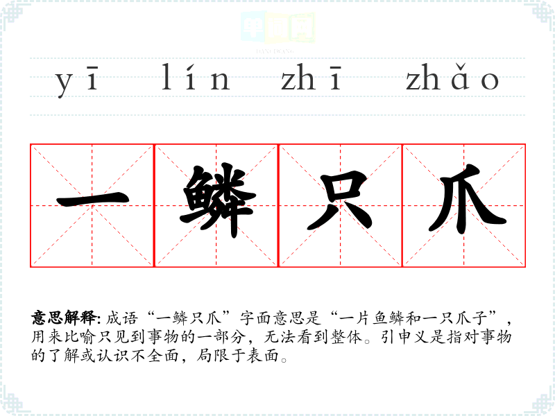 成语“一鳞只爪”字面意思是“一片鱼鳞和一只爪子”,用来比喻只见到事物的一部分,无法看到整体。引申义是指对事物的了解或认识不全面,局限于表面。