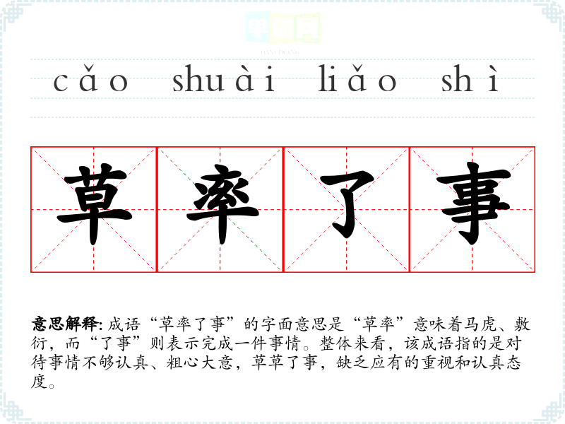 成语“草率了事”的字面意思是“草率”意味着马虎、敷衍,而“了事”则表示完成一件事情。整体来看,该成语指的是对待事情不够认真、粗心大意,草草了事,缺乏应有的重视和认真态度。