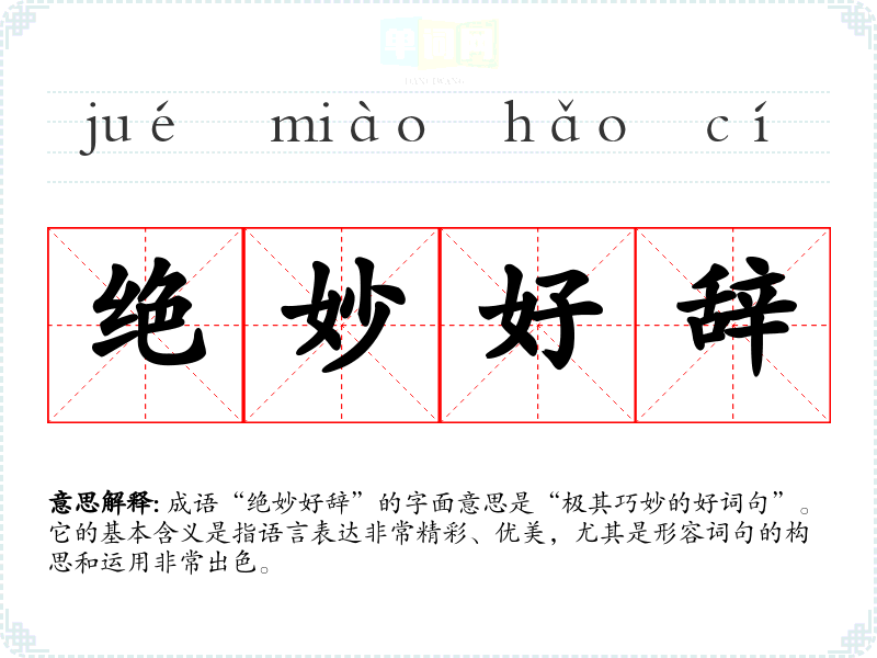 成语“绝妙好辞”的字面意思是“极其巧妙的好词句”。它的基本含义是指语言表达非常精彩、优美,尤其是形容词句的构思和运用非常出色。
