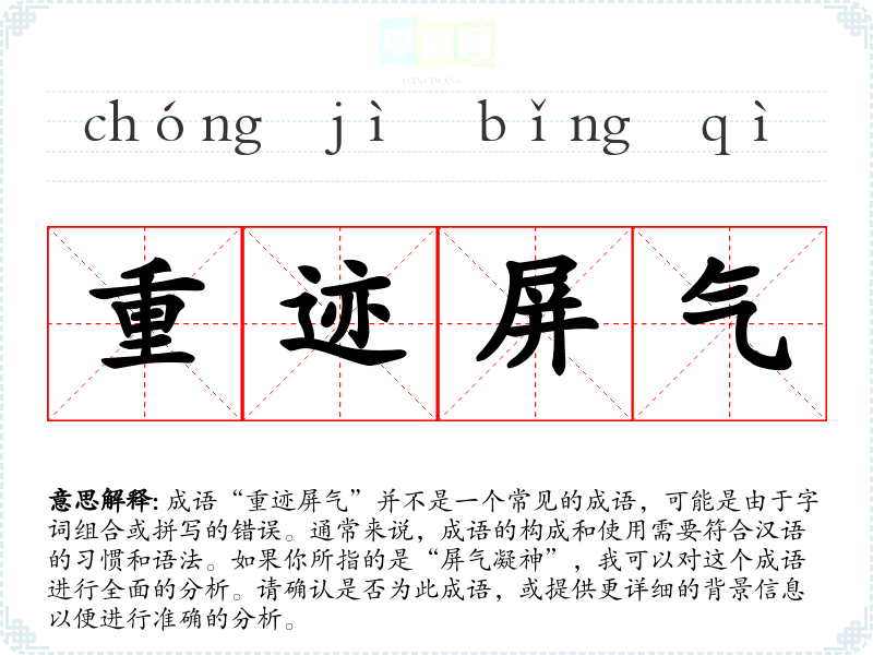 成语“重迹屏气”并不是一个常见的成语,可能是由于字词组合或拼写的错误。通常来说,成语的构成和使用需要符合汉语的*惯和语法。如果你所指的是“屏气凝神”,我可以对这个成语进行全面的分析。请确认是否为此成语,或提供更详细的背景信息以便进行准确的分析。