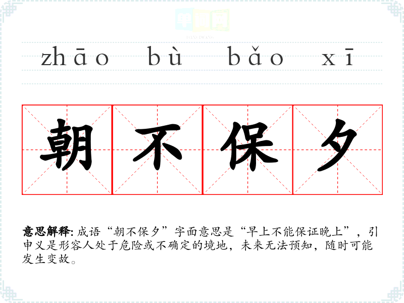成语“朝不保夕”字面意思是“早上不能保证晚上”,引申义是形容人处于危险或不确定的境地,未来无法预知,随时可能发生变故。