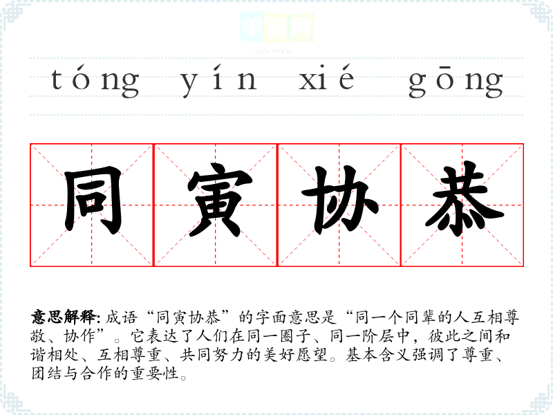 成语“同寅协恭”的字面意思是“同一个同辈的人互相尊敬、协作”。它表达了人们在同一圈子、同一阶层中,彼此之间和谐相处、互相尊重、共同努力的美好愿望。基本含义强调了尊重、团结与合作的重要性。