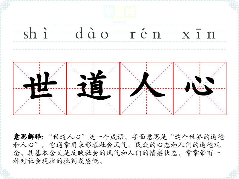 - 日常对话:人们在讨论社会问题时,常用“世道人心”来总结当前的社会风气。