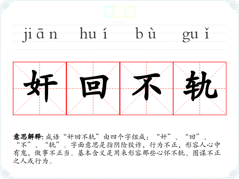 成语“奸回不轨”由四个字组成:“奸”、“回”、“不”、“轨”。字面意思是指阴险狡诈,行为不正,形容人心中有鬼,做事不正当。基本含义是用来形容那些心怀不轨、图谋不正之人或行为。