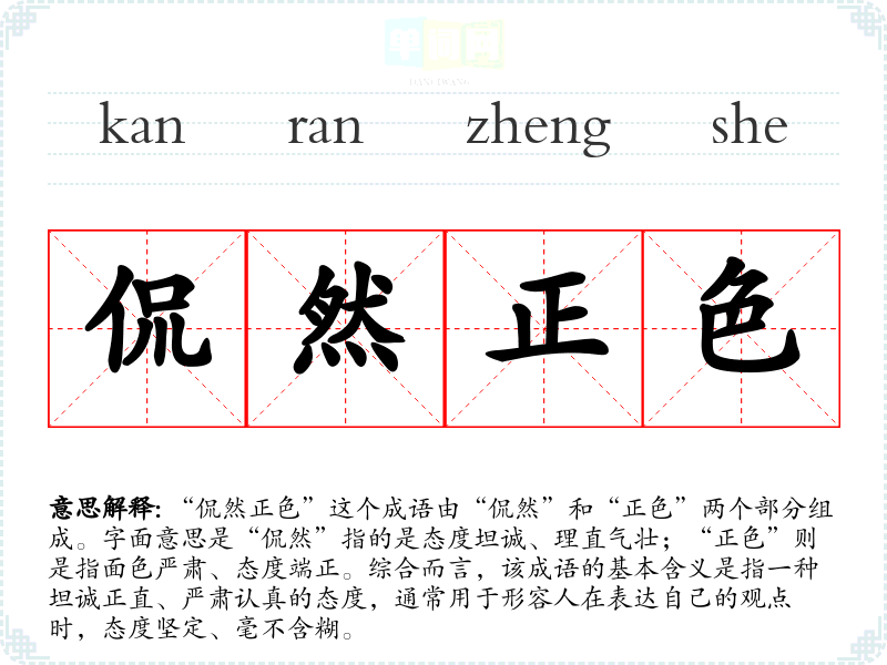 “侃然正色”这个成语由“侃然”和“正色”两个部分组成。字面意思是“侃然”指的是态度坦诚、理直气壮;“正色”则是指面色严肃、态度端正。综合而言,该成语的基本含义是指一种坦诚正直、严肃认真的态度,通常用于形容人在表达自己的观点时,态度坚定、毫不含糊。
