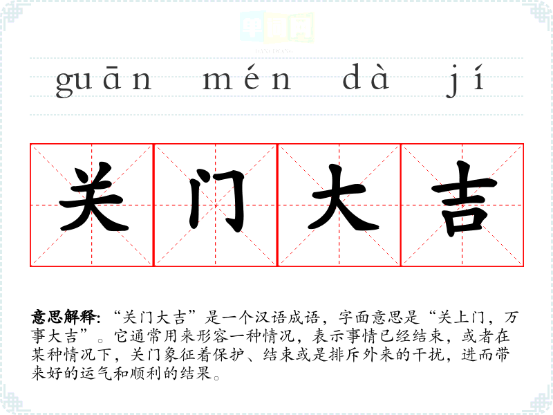 “关门大吉”是一个汉语成语,字面意思是“关上门,万事大吉”。它通常用来形容一种情况,表示事情已经结束,或者在某种情况下,关门象征着保护、结束或是排斥外来的干扰,进而带来好的运气和顺利的结果。