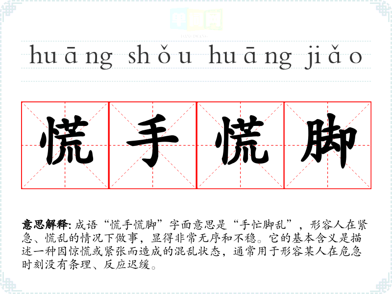 成语“慌手慌脚”字面意思是“手忙脚乱”,形容人在紧急、慌乱的情况下做事,显得非常无序和不稳。它的基本含义是描述一种因惊慌或紧张而造成的混乱状态,通常用于形容某人在危急时刻没有条理、反应迟缓。