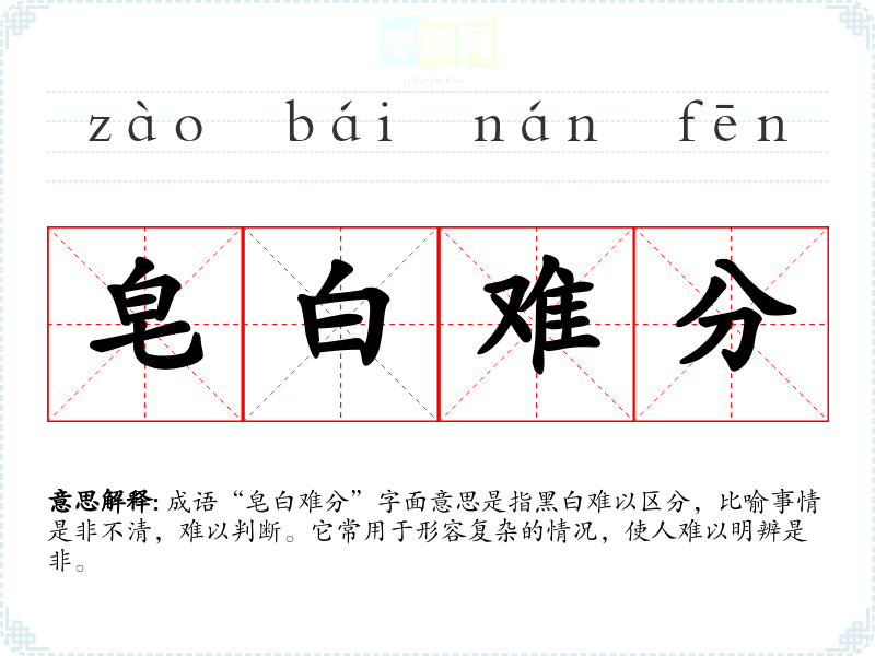成语“皂白难分”字面意思是指黑白难以区分,比喻事情是非不清,难以判断。它常用于形容复杂的情况,使人难以明辨是非。
