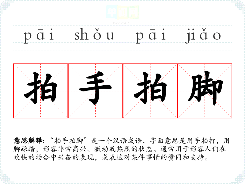 “拍手拍脚”是一个汉语成语,字面意思是用手拍打,用脚踩踏,形容非常高兴、激动或热烈的状态。通常用于形容人们在欢快的场合中兴奋的表现,或表达对某件事情的赞同和支持。