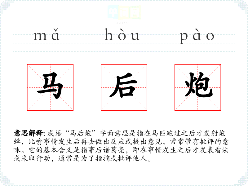 成语“马后炮”字面意思是指在马匹跑过之后才发射炮弹,比喻事情发生后再去做出反应或提出意见,常常带有批评的意味。它的基本含义是指事后诸葛亮,即在事情发生之后才发表看法或采取行动,通常是为了指摘或批评他人。