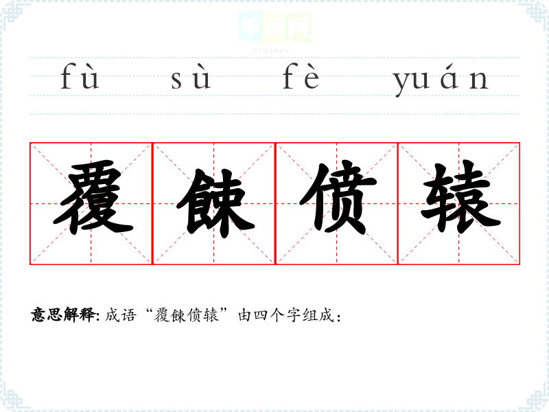 | 覆餗之衅 | 覆:翻;餗:鼎里的食物。鼎足坏了,食物倒出。指因不胜其力而坏事。 |