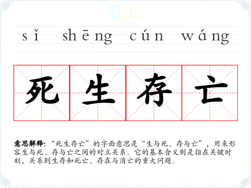 “死生存亡”的字面意思是“生与死、存与亡”,用来形容生与死、存与亡之间的对立关系。它的基本含义则是指在关键时刻,关系到生存和死亡、存在与消亡的重大问题。
