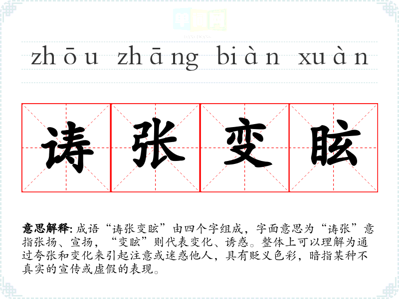 成语“诪张变眩”由四个字组成,字面意思为“诪张”意指张扬、宣扬,“变眩”则代表变化、诱惑。整体上可以理解为通过夸张和变化来引起注意或迷惑他人,具有贬义色彩,暗指某种不真实的宣传或虚假的表现。