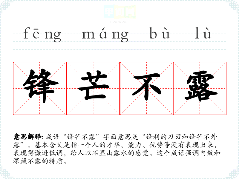 成语“锋芒不露”字面意思是“锋利的刀刃和锋芒不外露”。基本含义是指一个人的才华、能力、优势等没有表现出来,表现得谦逊低调,给人以不显山露水的感觉。这个成语强调内敛和深藏不露的特质。