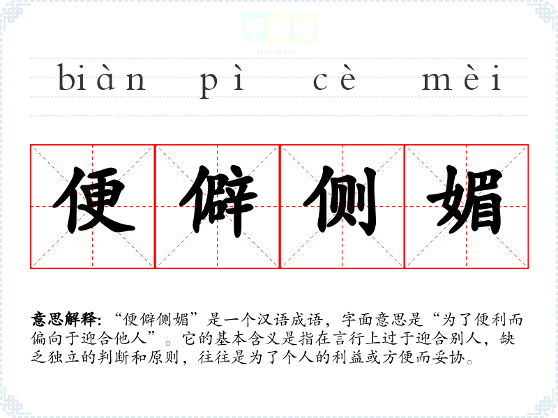 “便僻侧媚”是一个汉语成语,字面意思是“为了便利而偏向于迎合他人”。它的基本含义是指在言行上过于迎合别人,缺乏独立的判断和原则,往往是为了个人的利益或方便而妥协。