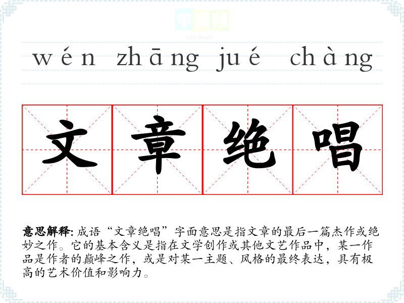 成语“文章绝唱”字面意思是指文章的最后一篇杰作或绝妙之作。它的基本含义是指在文学创作或其他文艺作品中,某一作品是作者的巅峰之作,或是对某一主题、风格的最终表达,具有极高的艺术价值和影响力。