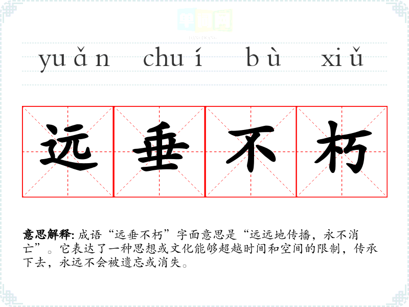 成语“远垂不朽”字面意思是“远远地传播,永不消亡”。它表达了一种思想或文化能够超越时间和空间的限制,传承下去,永远不会被遗忘或消失。