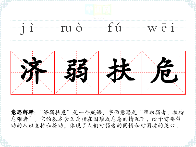 “济弱扶危”是一个成语,字面意思是“帮助弱者,扶持危难者”。它的基本含义是指在困难或危急的情况下,给予需要帮助的人以支持和援助,体现了人们对弱者的同情和对困境的关心。