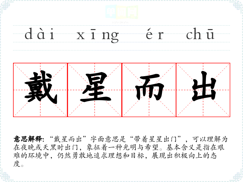 “戴星而出”字面意思是“带着星星出门”,可以理解为在夜晚或天黑时出门,象征着一种光明与希望。基本含义是指在艰难的环境中,仍然勇敢地追求理想和目标,展现出积极向上的态度。