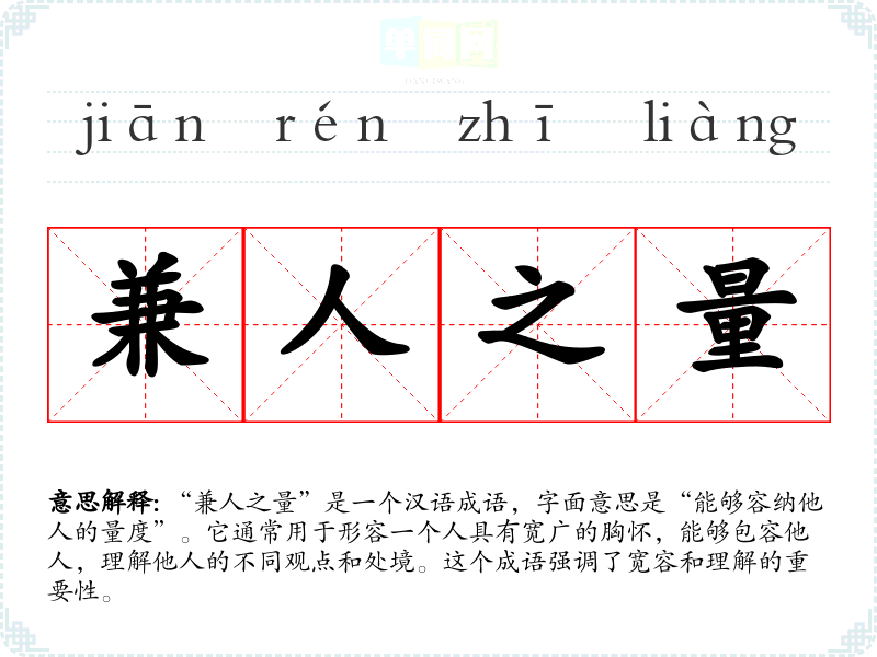 “兼人之量”是一个汉语成语,字面意思是“能够容纳他人的量度”。它通常用于形容一个人具有宽广的胸怀,能够包容他人,理解他人的不同观点和处境。这个成语强调了宽容和理解的重要性。