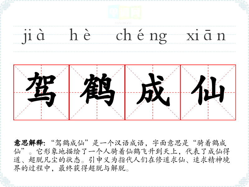 “驾鹤成仙”是一个汉语成语,字面意思是“骑着鹤成仙”。它形象地描绘了一个人骑着仙鹤飞升到天上,代表了成仙得道、超脱凡尘的状态。引申义为指代人们在修道求仙、追求精神境界的过程中,最终获得超脱与解脱。