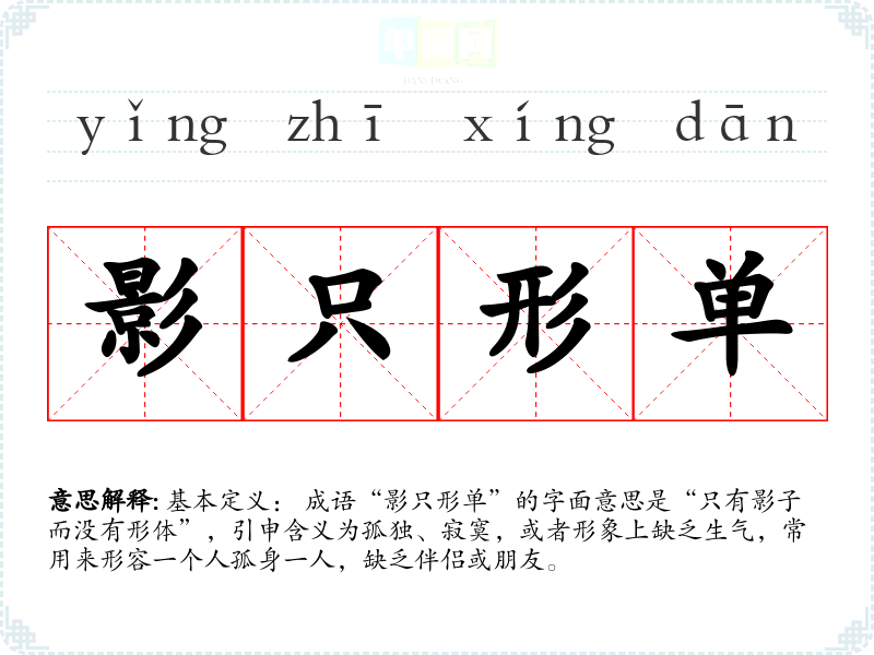 基本定义: 成语“影只形单”的字面意思是“只有影子而没有形体”,引申含义为孤独、寂寞,或者形象上缺乏生气,常用来形容一个人孤身一人,缺乏伴侣或朋友。