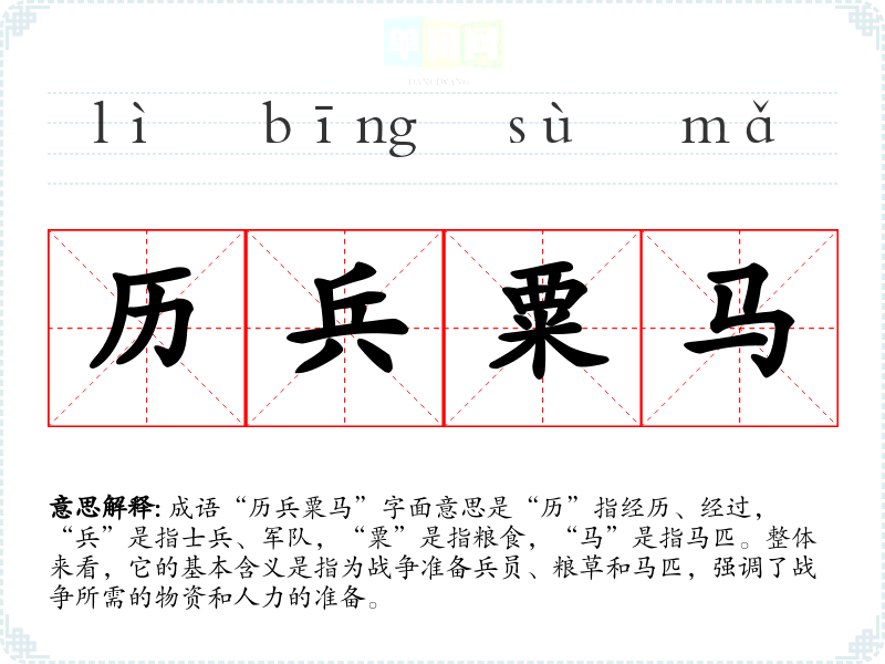 成语“历兵粟马”字面意思是“历”指经历、经过,“兵”是指士兵、军队,“粟”是指粮食,“马”是指马匹。整体来看,它的基本含义是指为战争准备兵员、粮草和马匹,强调了战争所需的物资和人力的准备。