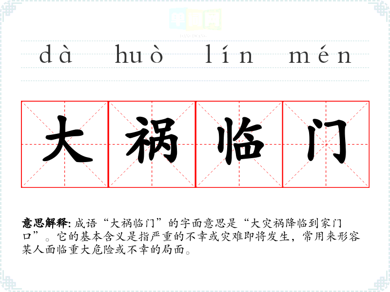 成语“大祸临门”的字面意思是“大灾祸降临到家门口”。它的基本含义是指严重的不幸或灾难即将发生,常用来形容某人面临重大危险或不幸的局面。