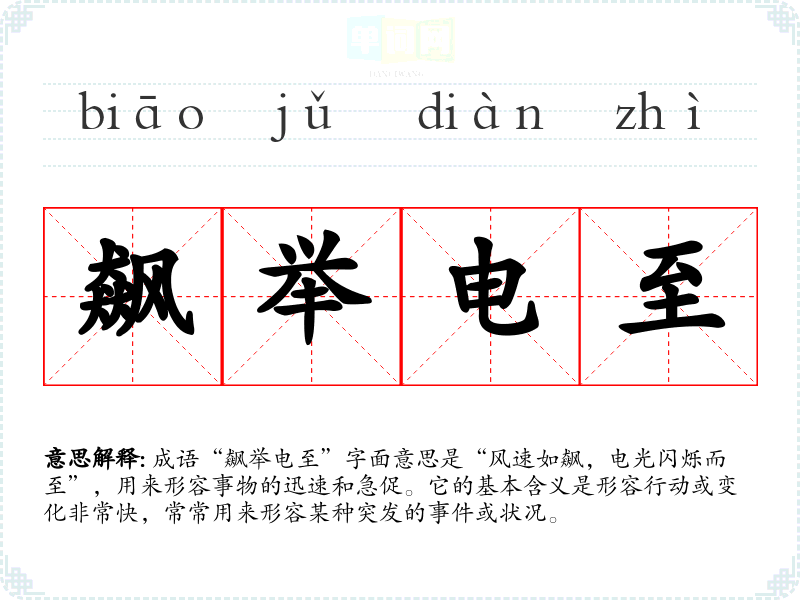 - 反义成语:迟迟迟迟。这个成语形容行动缓慢,与“飙举电至”的急速形成鲜明对比。
