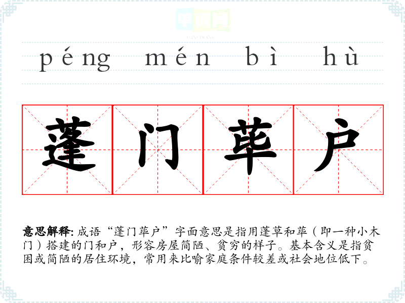 成语“蓬门荜户”字面意思是指用蓬草和荜(即一种小木门)搭建的门和户,形容房屋简陋、贫穷的样子。基本含义是指贫困或简陋的居住环境,常用来比喻家庭条件较差或社会地位低下。