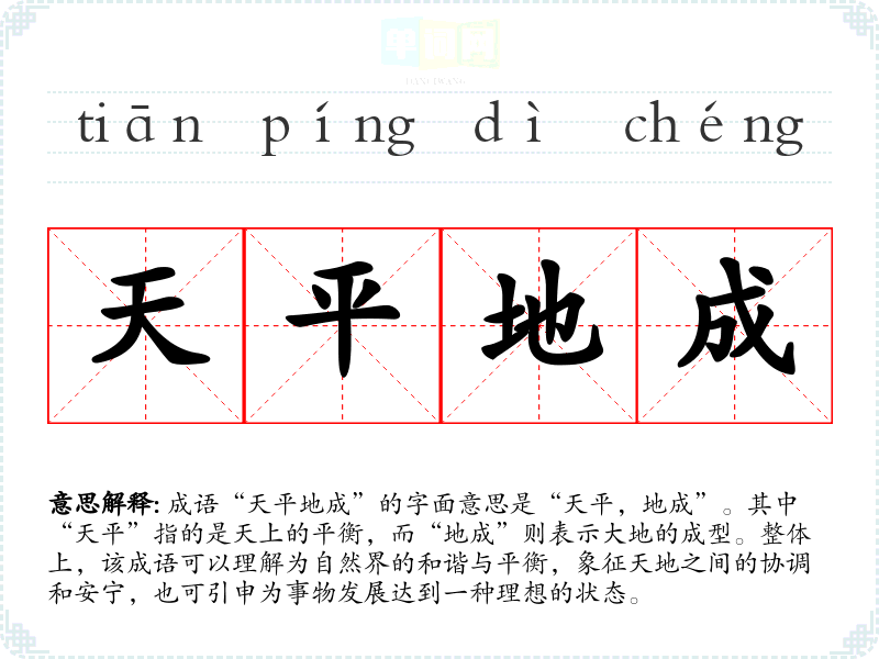 成语“天平地成”的字面意思是“天平,地成”。其中“天平”指的是天上的平衡,而“地成”则表示大地的成型。整体上,该成语可以理解为自然界的和谐与平衡,象征天地之间的协调和安宁,也可引申为事物发展达到一种理想的状态。
