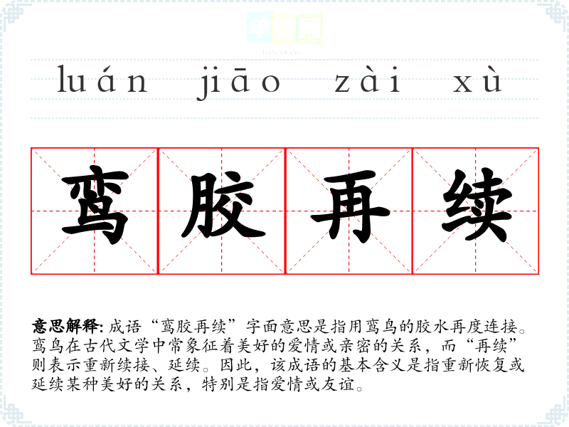 成语“鸾胶再续”字面意思是指用鸾鸟的胶水再度连接。鸾鸟在古代文学中常象征着美好的爱情或亲密的关系,而“再续”则表示重新续接、延续。因此,该成语的基本含义是指重新恢复或延续某种美好的关系,特别是指爱情或友谊。