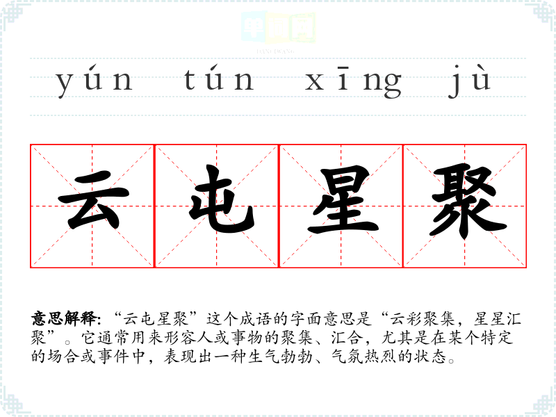 “云屯星聚”这个成语的字面意思是“云彩聚集,星星汇聚”。它通常用来形容人或事物的聚集、汇合,尤其是在某个特定的场合或**中,表现出一种生气勃勃、气氛热烈的状态。