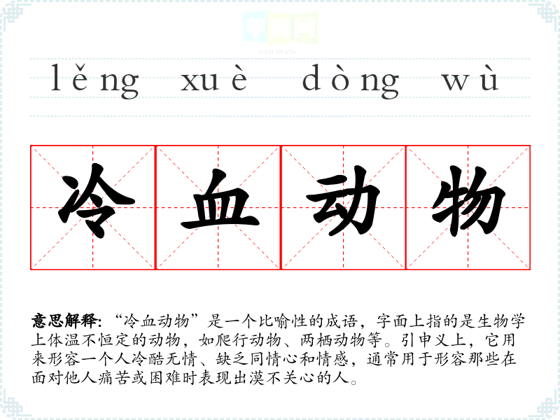 “冷血动物”是一个比喻性的成语,字面上指的是生物学上体温不恒定的动物,如爬行动物、两栖动物等。引申义上,它用来形容一个人冷酷无情、缺乏同情心和情感,通常用于形容那些在面对他人痛苦或困难时表现出漠不关心的人。