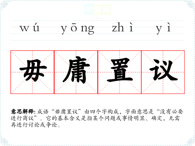 | 毋庸置议 | 毋:无:毋庸:不必,无须;置议:进行讨论。不需要讨论。指事实或道理很清楚。 |