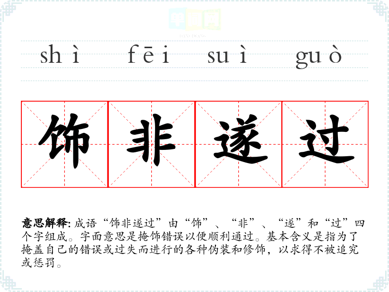 成语“饰非遂过”由“饰”、“非”、“遂”和“过”四个字组成。字面意思是掩饰错误以便顺利通过。基本含义是指为了掩盖自己的错误或过失而进行的各种伪装和修饰,以求得不被追究或惩罚。
