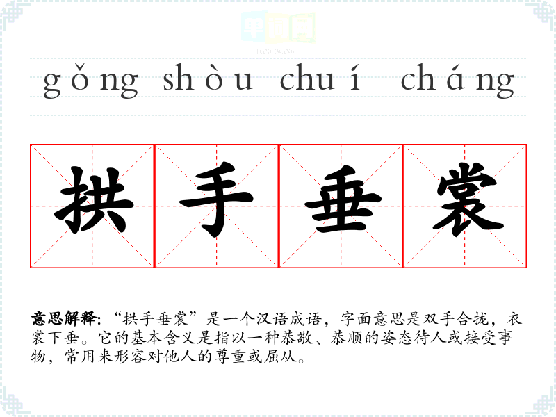 “拱手垂裳”是一个汉语成语,字面意思是双手合拢,衣裳下垂。它的基本含义是指以一种恭敬、恭顺的姿态待人或接受事物,常用来形容对他人的尊重或屈从。