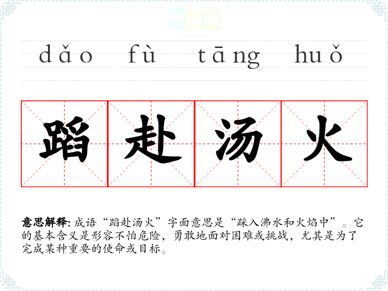成语“蹈赴汤火”字面意思是“踩入沸水和火焰中”。它的基本含义是形容不怕危险,勇敢地面对困难或挑战,尤其是为了完成某种重要的使命或目标。