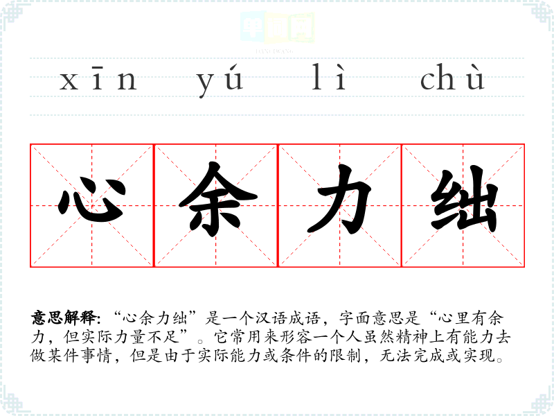 “心余力绌”是一个汉语成语,字面意思是“心里有余力,但实际力量不足”。它常用来形容一个人虽然精神上有能力去做某件事情,但是由于实际能力或条件的限制,无法完成或实现。