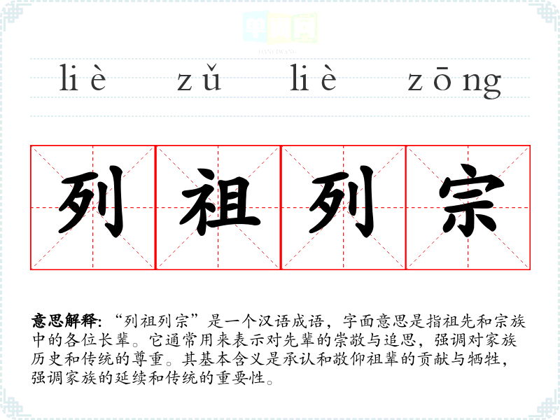 - 日常对话:人们在谈论家庭历史、家族传统时,可能会提到“列祖列宗”来强调对祖先的尊重。