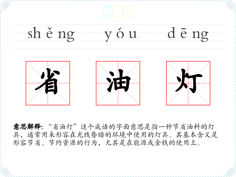 “省油灯”这个成语的字面意思是指一种节省油料的灯具,通常用来形容在光线昏暗的环境中使用的灯具。其基本含义是形容节省、节约资源的行为,尤其是在能源或金钱的使用上。