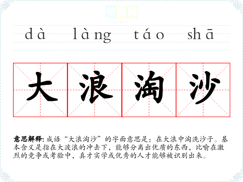 成语“大浪淘沙”的字面意思是:在大浪中淘洗沙子。基本含义是指在大波浪的冲击下,能够分离出优质的东西,比喻在激烈的竞争或考验中,真才实学或优秀的人才能够被识别出来。