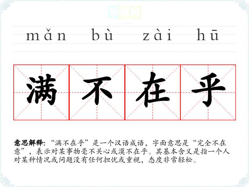 “满不在乎”是一个汉语成语,字面意思是“完全不在意”,表示对某事物毫不关心或漠不在乎。其基本含义是指一个人对某种情况或问题没有任何担忧或重视,态度非常轻松。