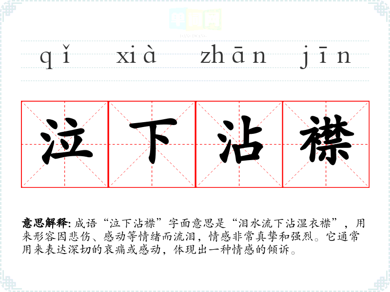 成语“泣下沾襟”字面意思是“泪水流下沾湿衣襟”,用来形容因悲伤、感动等情绪而流泪,情感非常真挚和强烈。它通常用来表达深切的哀痛或感动,体现出一种情感的倾诉。