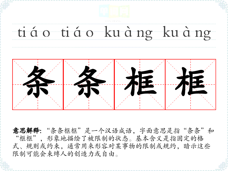 “条条框框”是一个汉语成语,字面意思是指“条条”和“框框”,形象地描绘了被限制的状态。基本含义是指固定的格式、规则或约束,通常用来形容对某事物的限制或规约,暗示这些限制可能会束缚人的创造力或自由。