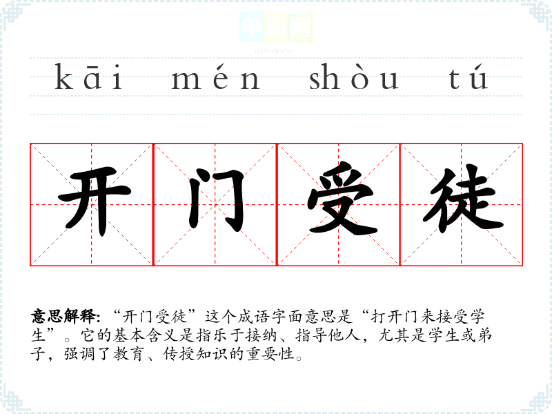 “开门受徒”这个成语字面意思是“打开门来接受学生”。它的基本含义是指乐于接纳、指导他人,尤其是学生或弟子,强调了教育、传授知识的重要性。