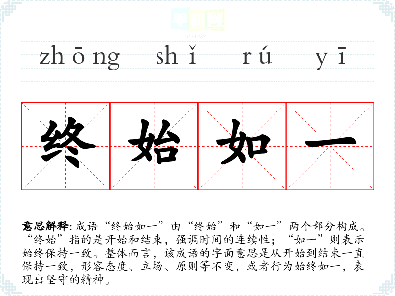 成语“终始如一”由“终始”和“如一”两个部分构成。“终始”指的是开始和结束,强调时间的连续性;“如一”则表示始终保持一致。整体而言,该成语的字面意思是从开始到结束一直保持一致,形容态度、立场、原则等不变,或者行为始终如一,表现出坚守的精神。