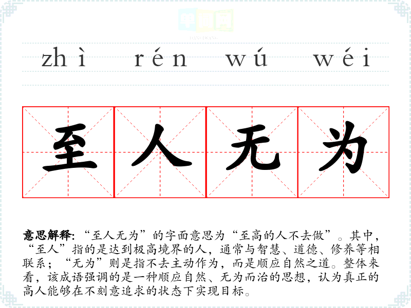 “至人无为”的字面意思为“至高的人不去做”。其中,“至人”指的是达到极高境界的人,通常与智慧、道德、修养等相联系;“无为”则是指不去主动作为,而是顺应自然之道。整体来看,该成语强调的是一种顺应自然、无为而治的思想,认为真正的高人能够在不刻意追求的状态下实现目标。